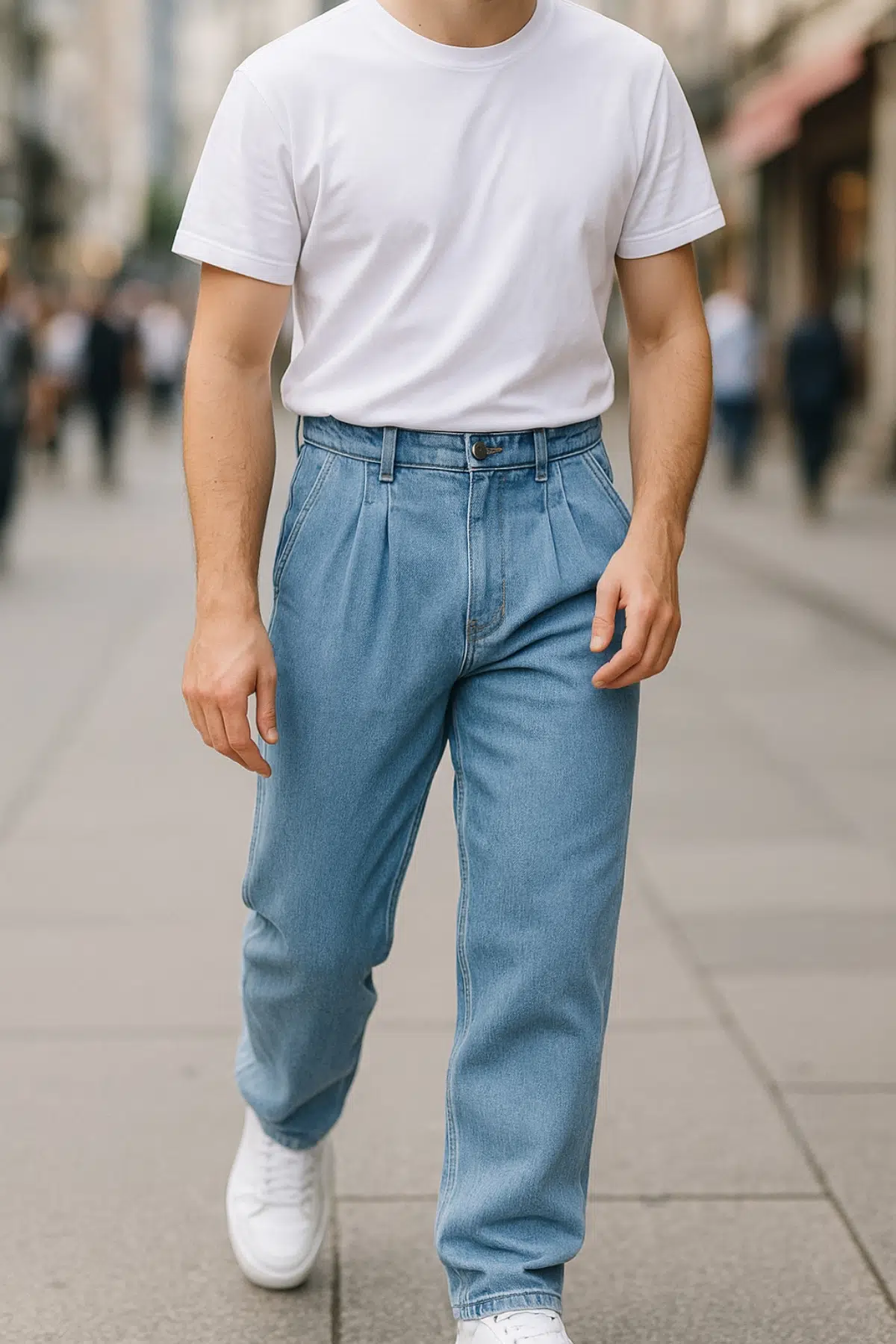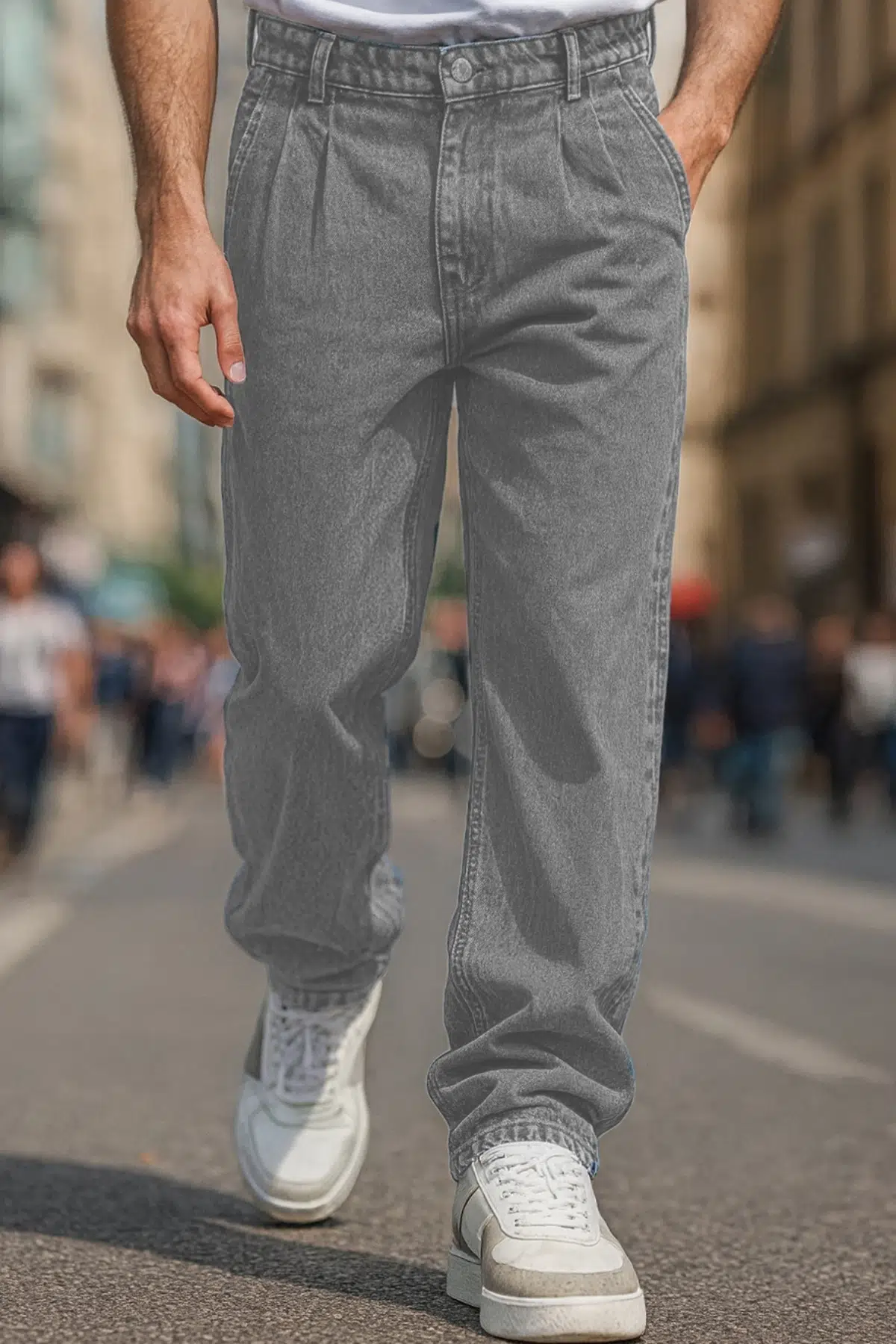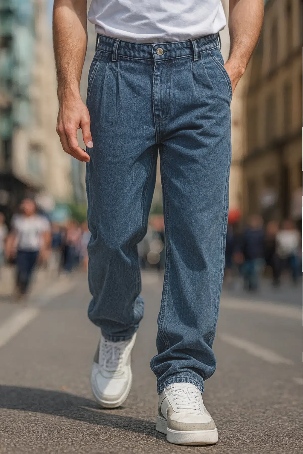 Eskitme yıkama, esnek olmayan, 5 cepli Baggy Fit Pileli Bol Kesim Jean Pantolon
